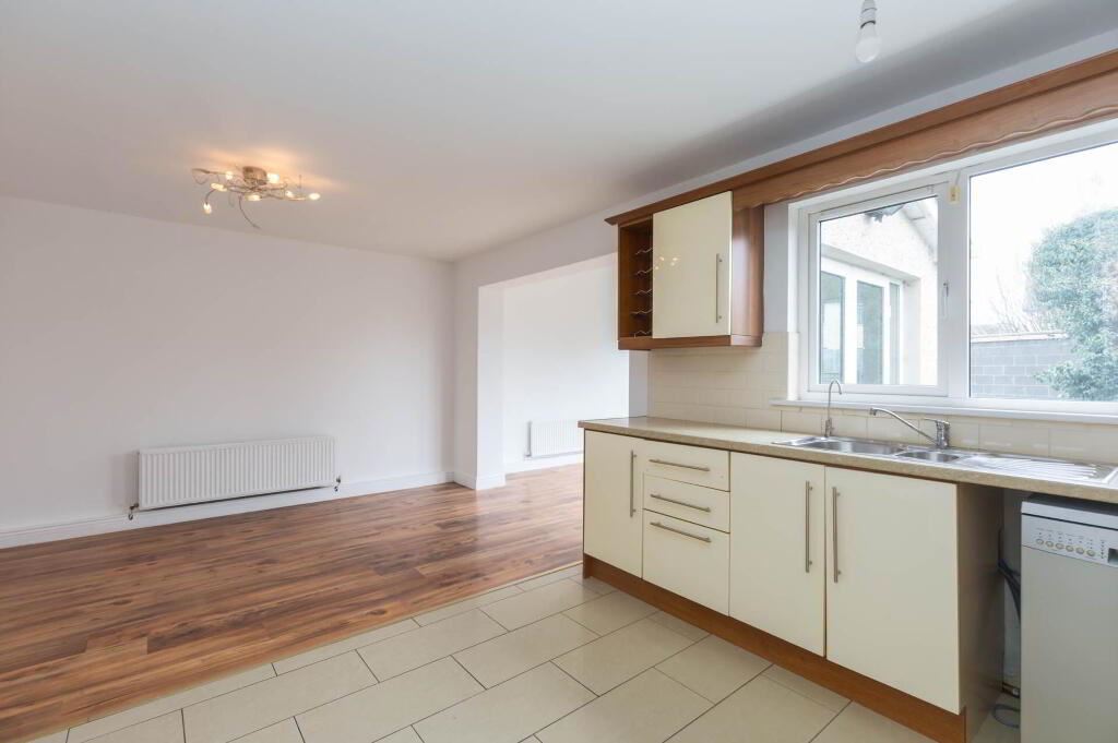 Range of floor eye level fitted press units with tiled splashback. Integrated single oven, gas hob extractor fan. Plumbed for dishwasher. Tiled floor to kitchen with laminate wood floor to dining area. French doors to rear garden.