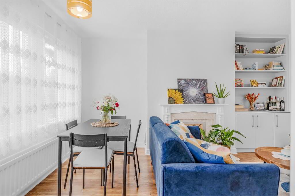 Bright and spacious room to front of property overlooking the green area with feature fireplace, built in storage unit and wooden flooring