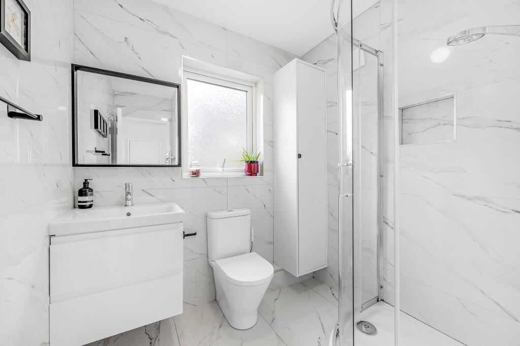 Stunning modern bathroom fully tiled floor to ceiling with window located to rear of apartment