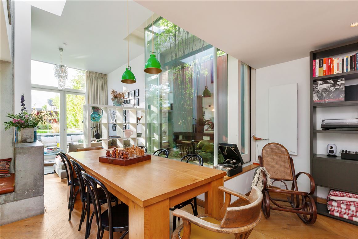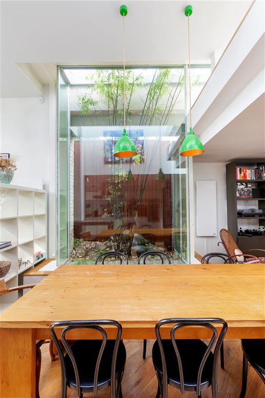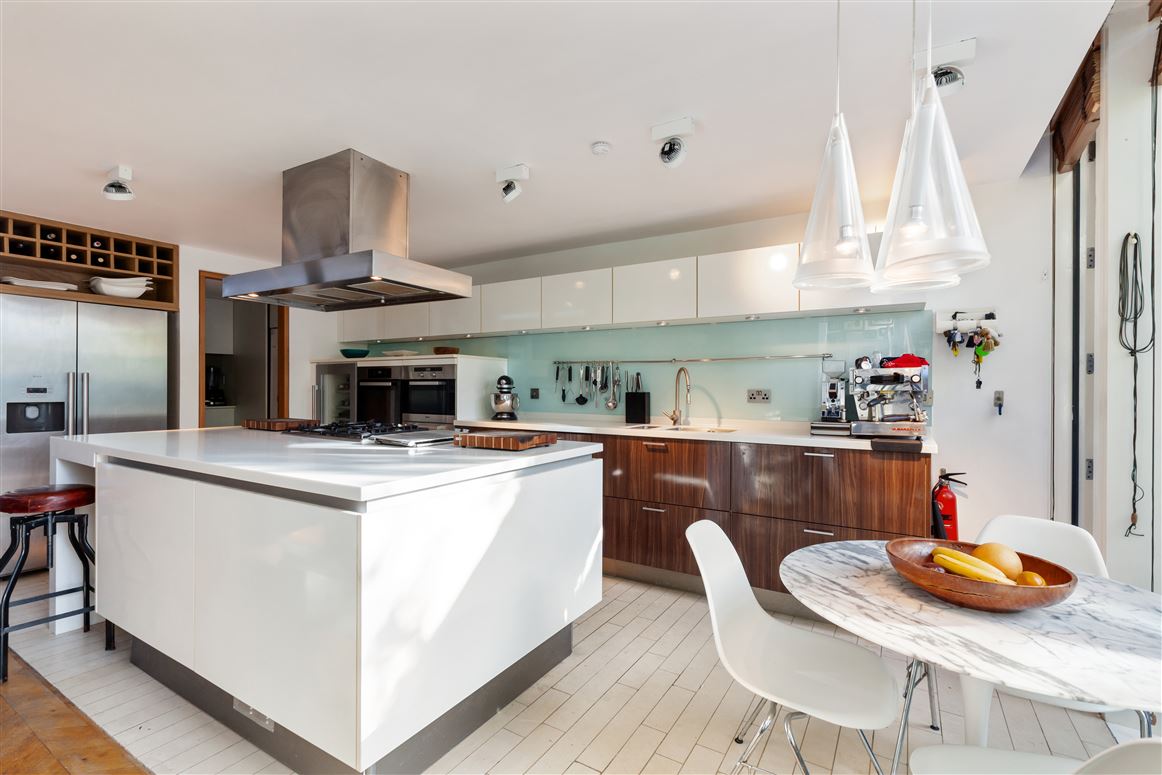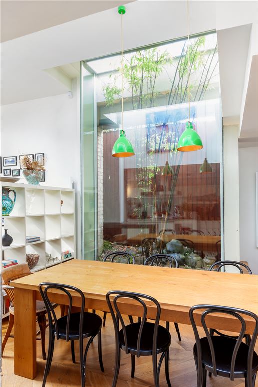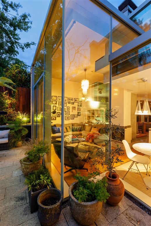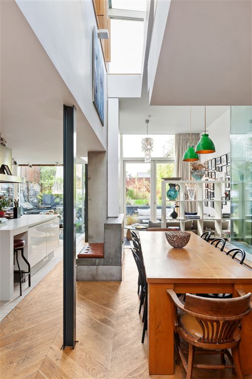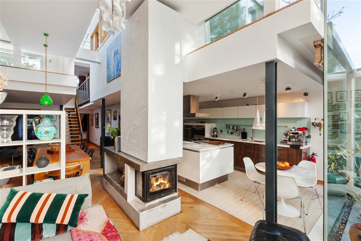 Generous dining area overlooking the rear garden with patio doors to the rear, feature wood burning stove (6kW) integrated into a concrete centre shaft and feature light well with tropical planting and night lighting.