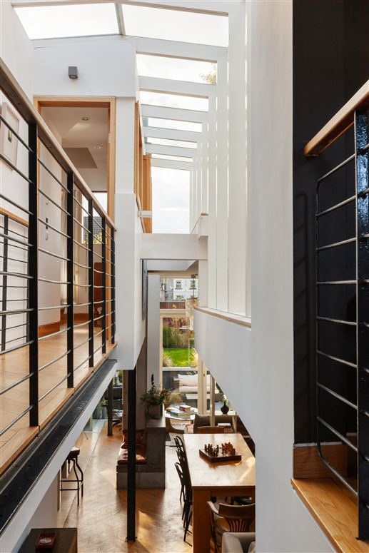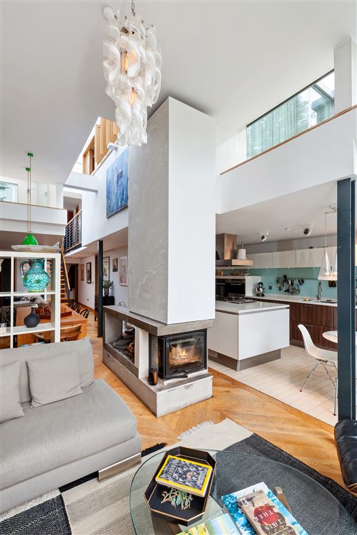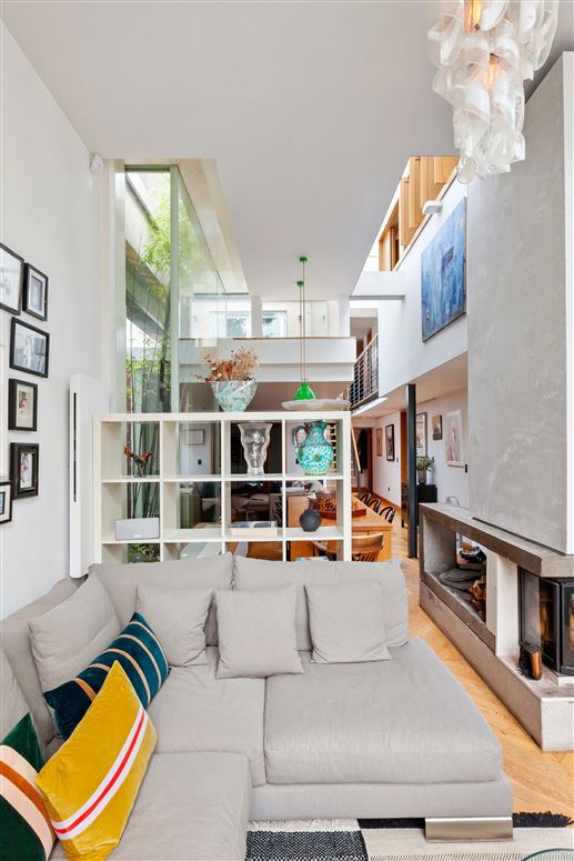 At the heart of the home is a dramatic “spine of light”—a soaring atrium over 5m high and almost 9m long—that draws sunlight deep into the house. Floor-to-ceiling Californian glass panels at the rear dissolve the boundary between interior and garden, framing views of mature trees and sky throughout the seasons. Ever changing skies viewed through a glazed roof/ atrium become part of the daily backdrop, creating a living environment that shifts beautifully with the seasons. The house was deliberately designed to minimise overlooking to adjacent properties, and maximise the ingress of natural light, ensuring privacy from all aspects, whilst maximising winter light ingress. At the heart of the living area, a six-metre concrete column subtly defines zones within the open plan. Housing an enclosed fireplace and a polished concrete hearth with integrated timber storage, it becomes both a functional and sculptural element. Oriented to the west, the fireplace captures the glow of long summer evenings, while in winter it transforms the space into a warm, inviting retreat.