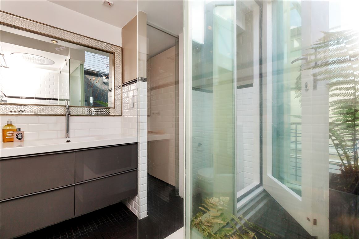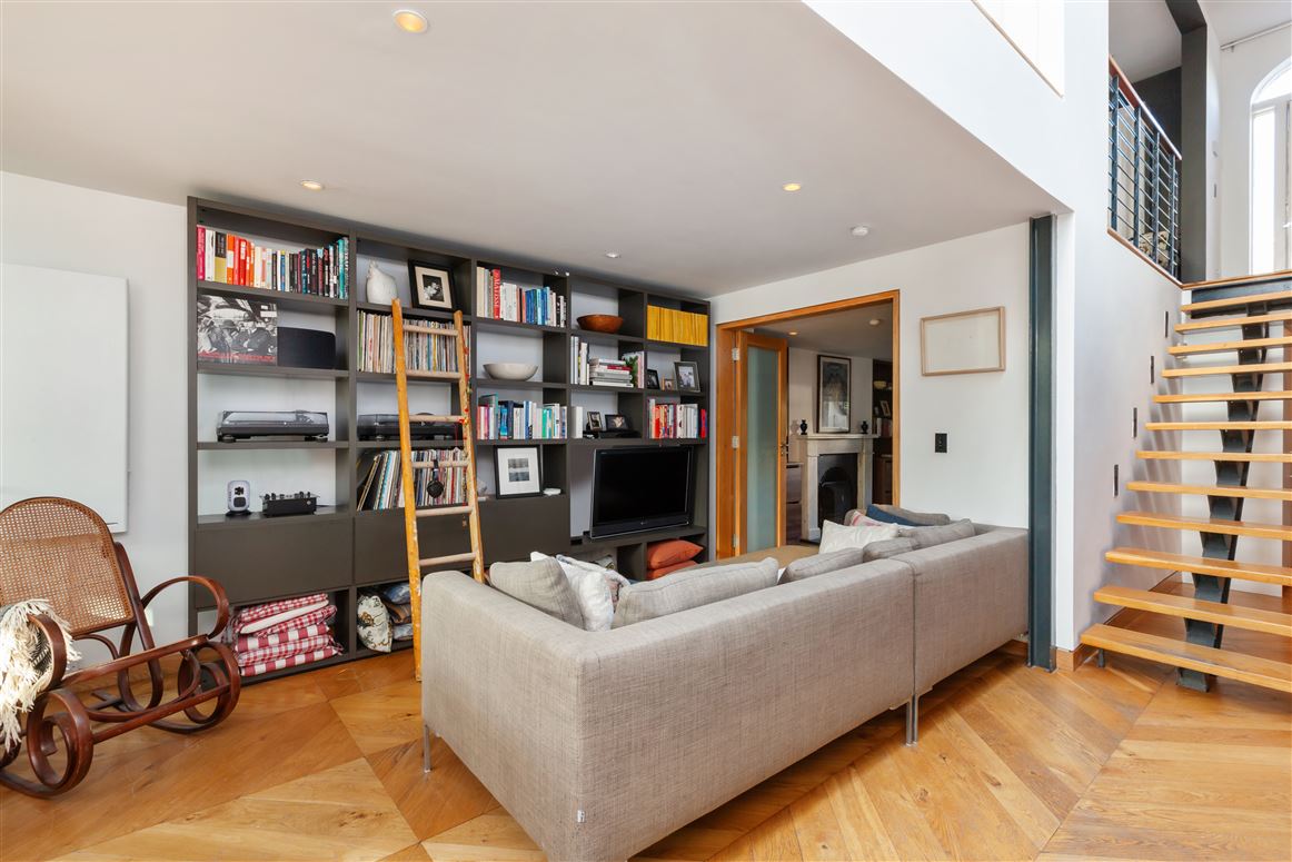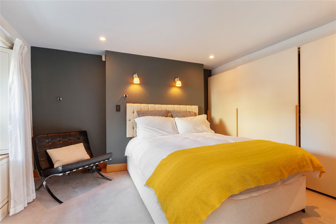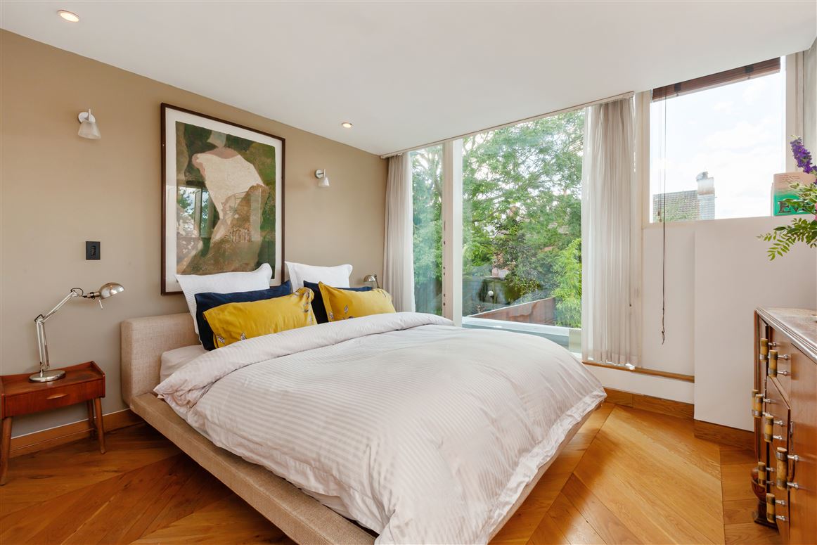 Large double bedroom to the rear of the house with floor-to-ceiling windows overlooking the rear garden with expanses of glazing, American oak herringbone parquet flooring, Velux window, north facing hardwood shutters and recessed lighting. Access to: