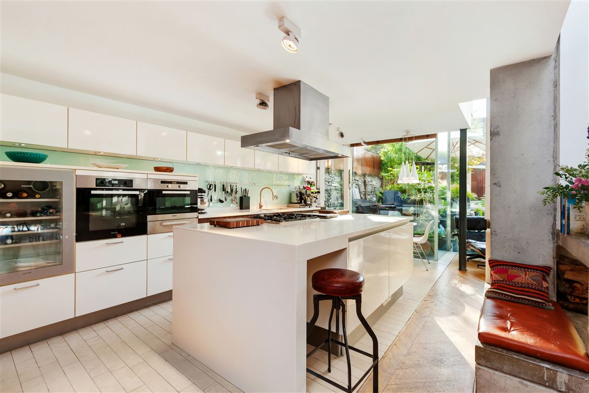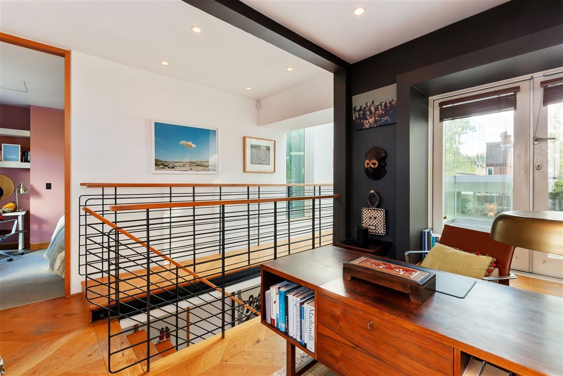 Every space has been crafted for both intimacy and connection. Open-plan living areas flow seamlessly, anchored by a sculptural concrete fireplace and a Poggenpohl kitchen with premium appliances. Bedrooms are calm retreats, including a master suite approached by a light-framed bridge and complemented by a private planted lightwell. A sculptural oak staircase links these private rooms to the open-plan living area. Landscaped terraces, a sunken lower ground, and discreet lighting extend the living experience seamlessly into the garden - equally perfect for tranquil evenings or entertaining on a grand scale.