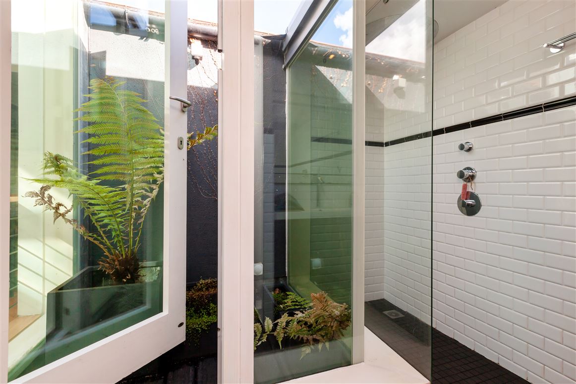 With Duvrait WC, wash hand basin with storage and walk-in Hansgrohe Rainmaker Shower Walled and Phillipe Starck taps. Feature atrium with tropical planting
