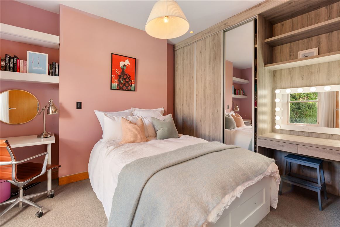Large double bedroom to front of the house with plush carpet flooring, built-in wardrobes, vanity unit and recessed lighting.