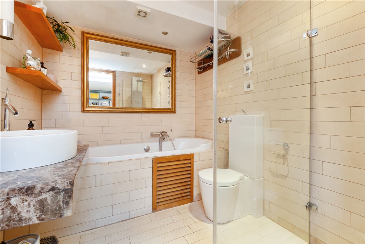 With Portuguese Limestone, Philippe Starck Duravit WC, wash hand basin and taps Philippe Starck Duravit bathtub and taps, heated towel rail and walk-in Hansgrohe rain shower