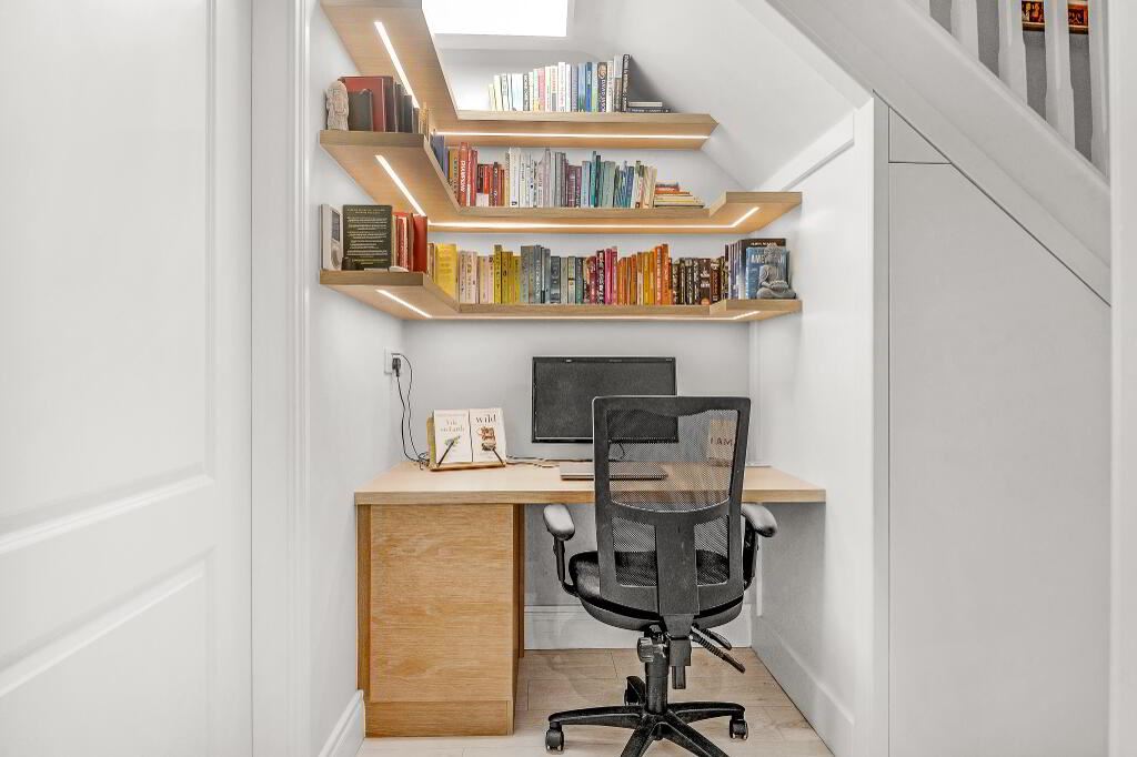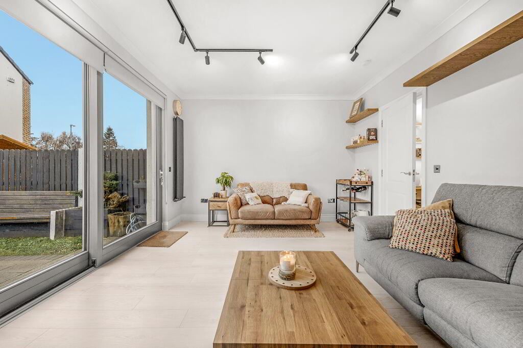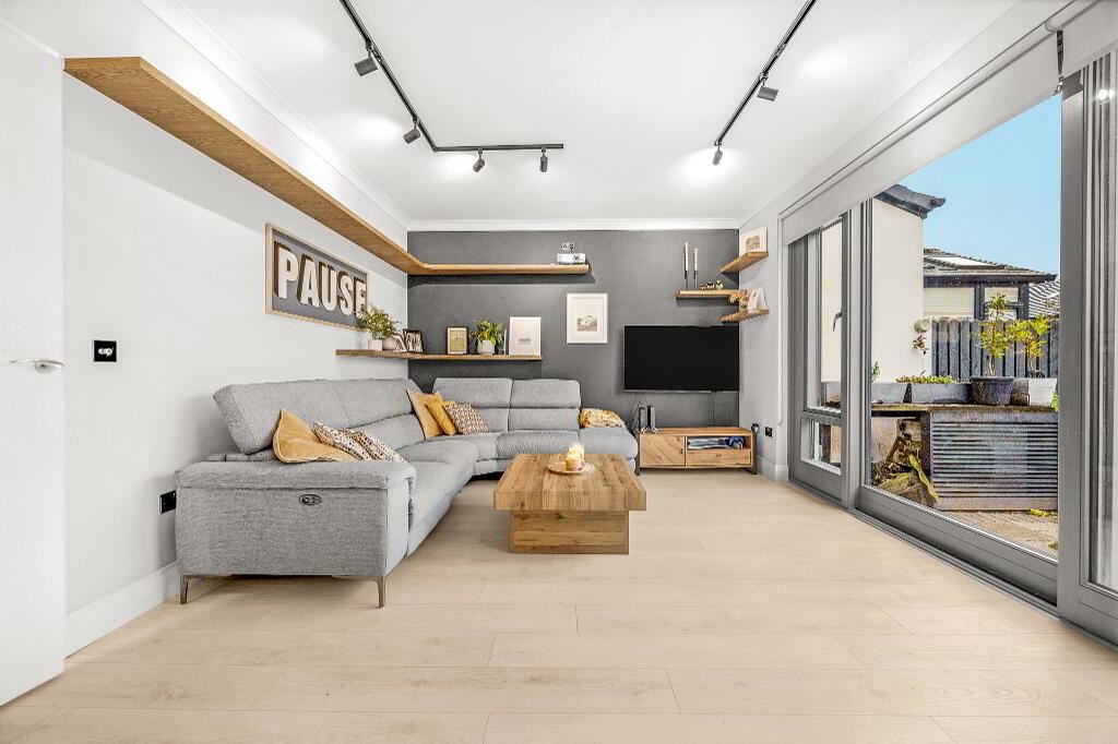 With wooden flooring, ceiling strip lighting, chrome switches and sockets. Large sliding doors lead to the rear landscaped garden complete with paved patio, raised planters and garden shed.