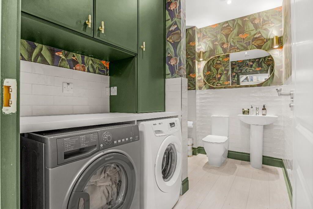 Wooden flooring, WC, WHB, part tiled walls and feature wall paper. Downlighters and wall lighting. Laundry area with storage and space for washing machine clothes dryer.