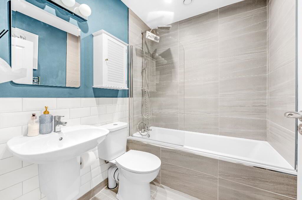 Tiled floor and part tiles walls. Walk in shower with slimline shower tray, rain shower and handset attachment. Wall mounted WHB, WC. Heated towel rail.