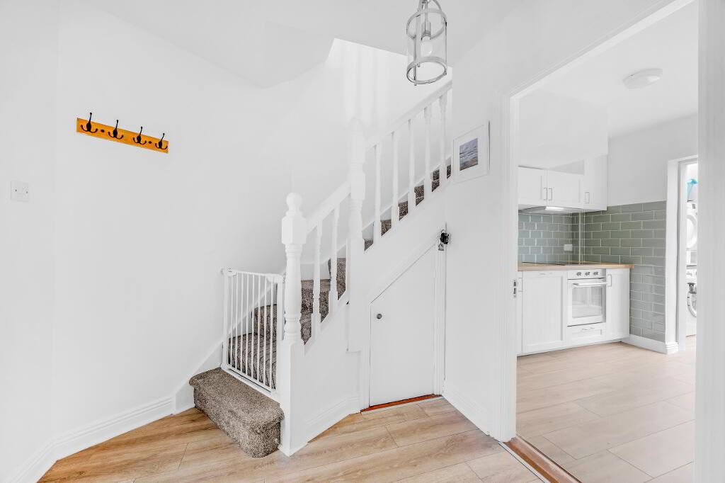 The entrance hallway has wood effect flooring and there is access to under stairs storage.
