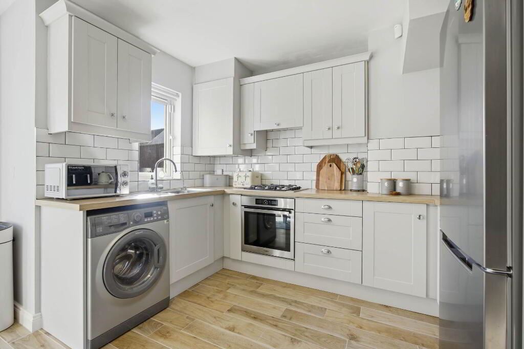 Range of floor eye level fitted press units with tiled splashback. Integrated single oven, gas hob extractor fan. Plumbed for washing machine. Tiled floor French patio doors to rear garden.