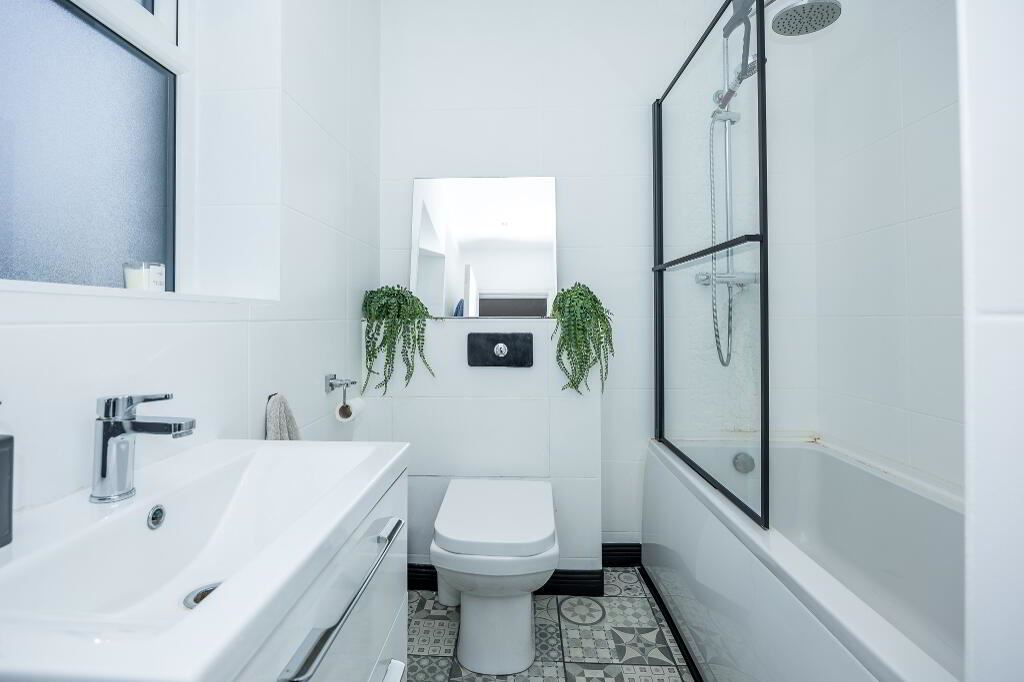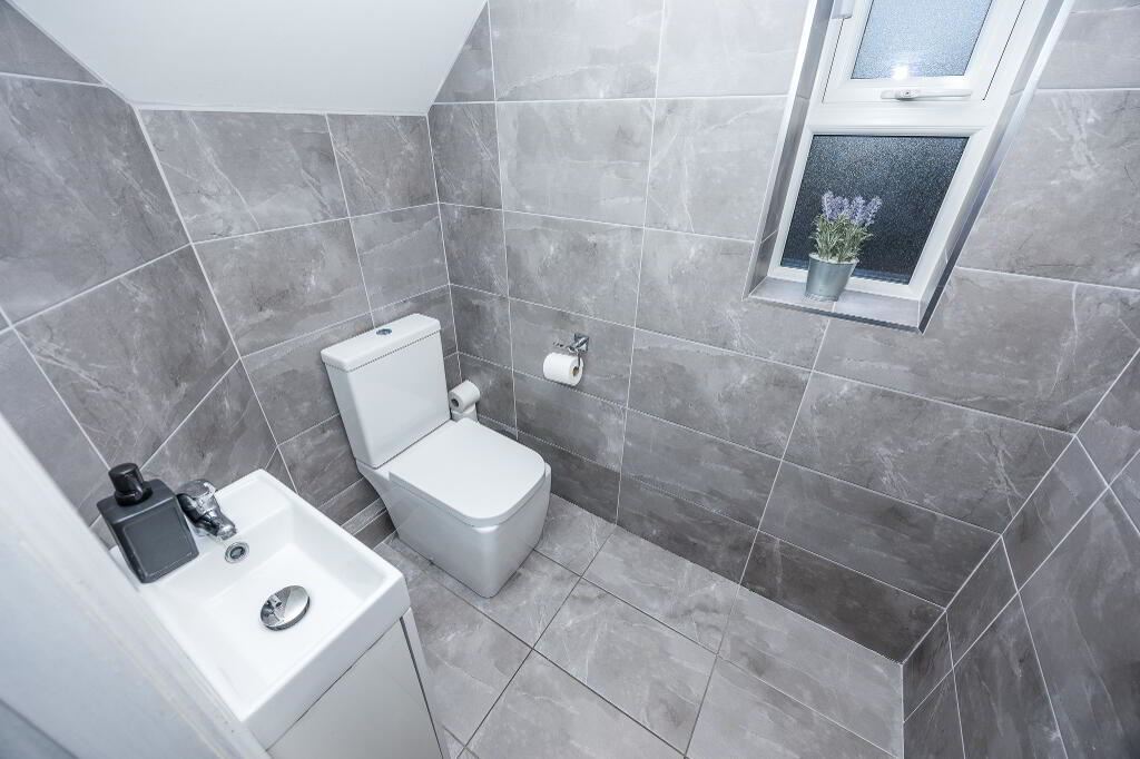 Tiled floor to ceiling with wc, whb and bath with shower.