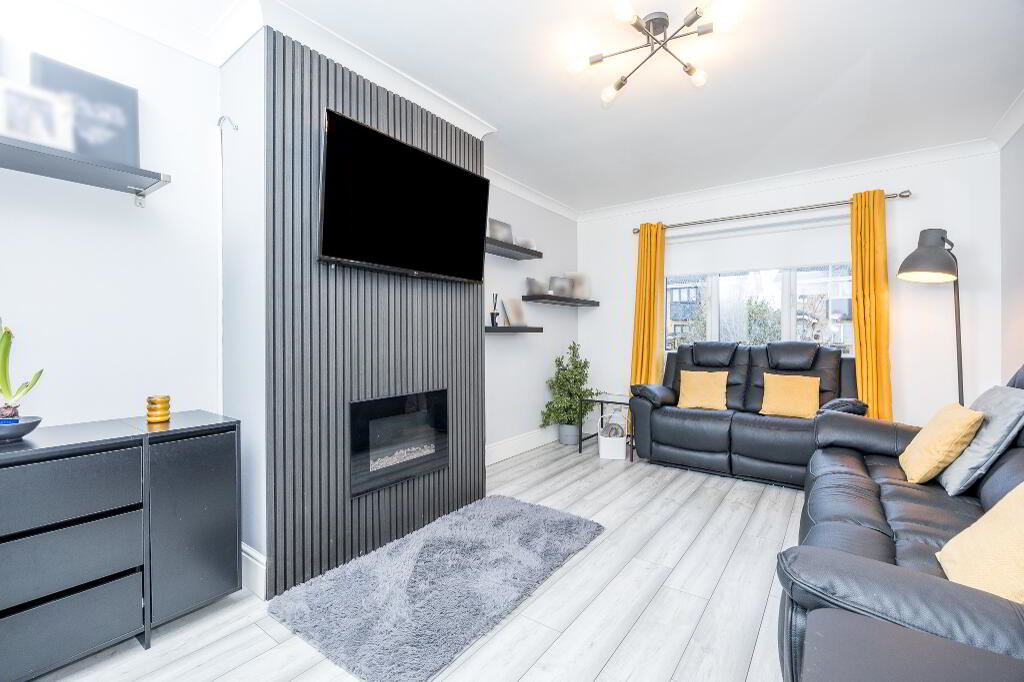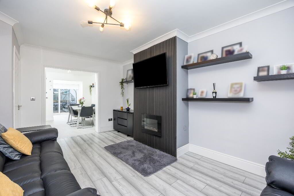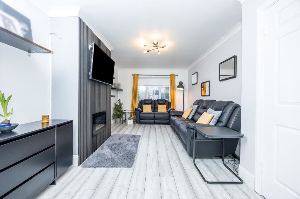 Stylish living room located to the front with wood effect flooring and built in fire unit.