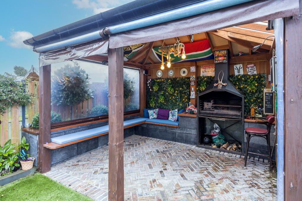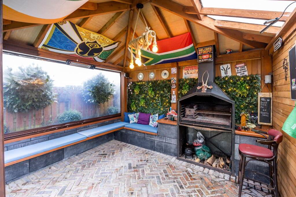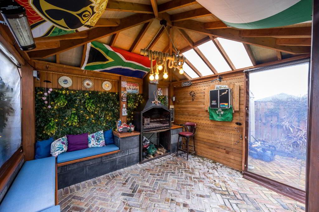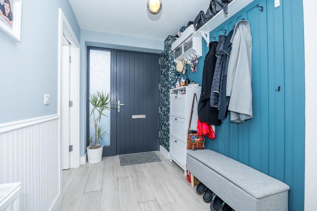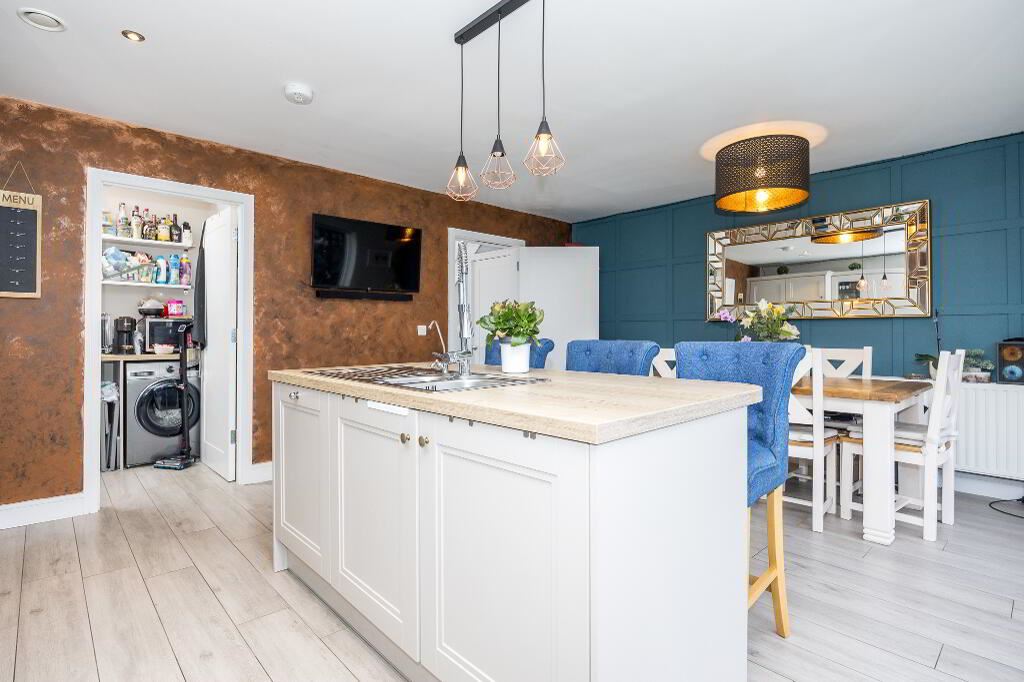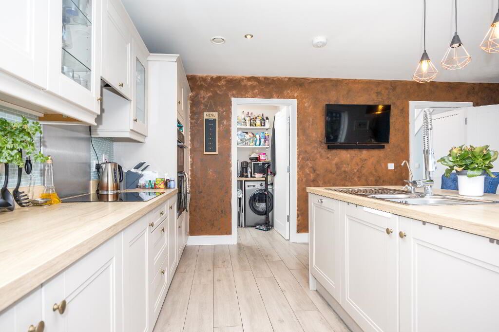 Located off the kitchen, plumbed for washing machine and tumble dryer with ample storage.
