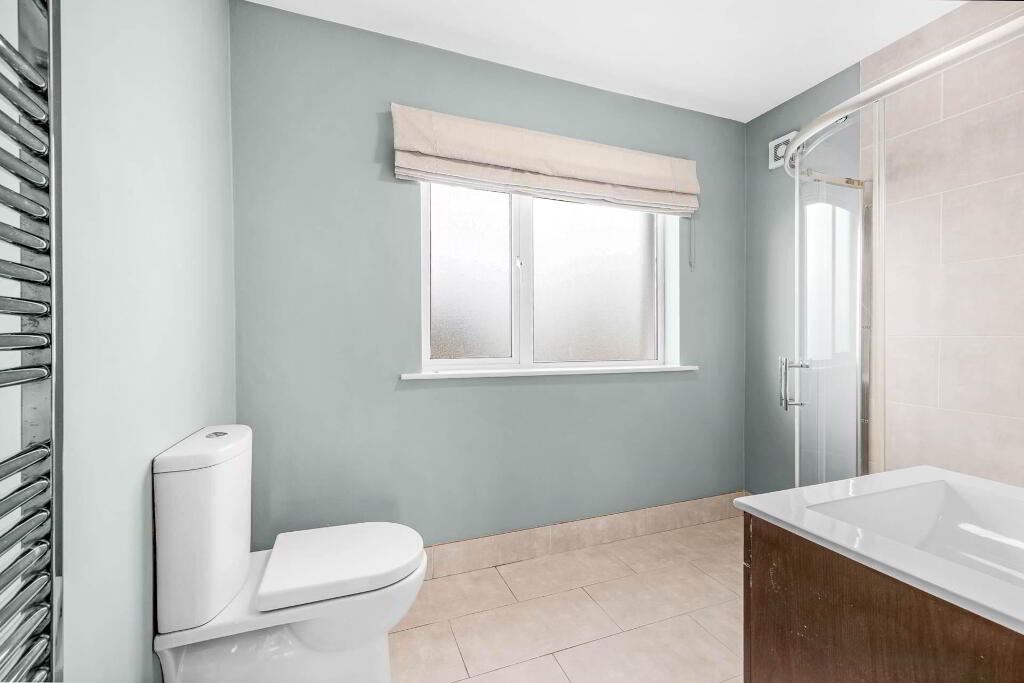 Comprising w.c. w.h.b. with vanity unit shower cubicle with power shower. Tiled floor partially tiled walls. Heated towel rail. Window.