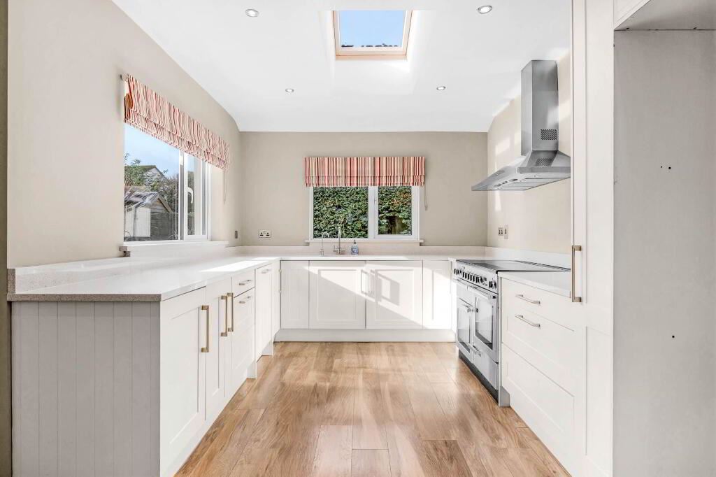Range of fitted press units with marble countertops and upstands. Integrated dishwasher. Rangemaster oven extractor fan. Velux window. Laminate wood floor. Recessed lighting.