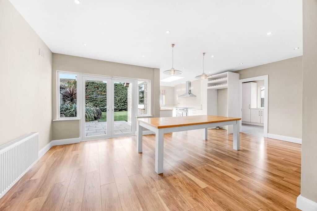 Open plan with kitchen, laminate wood floor, recessed lighting, French doors to rear garden.