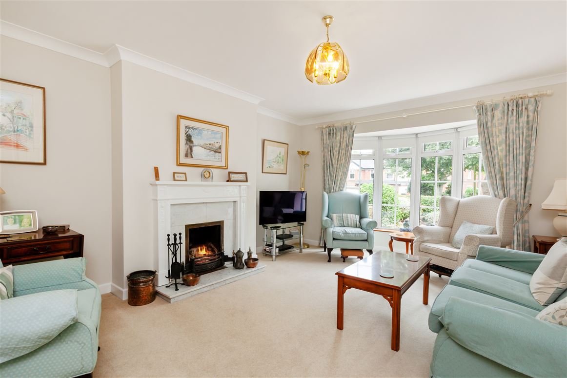 Large bright room to the front of the house with bay window and ceiling coving, and open fireplace with wooden surround