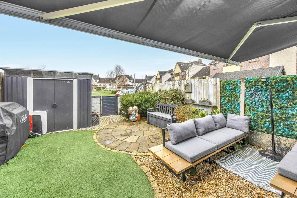 Externally, the west facing rear garden is finished with a mix of paving slabs and stone, and includes an awning, new metal shed and matching metal back gate. To the front, there is one designated parking space. Additional features include gas fired central heating, upgraded double glazed windows, and upgraded front and rear composite doors.