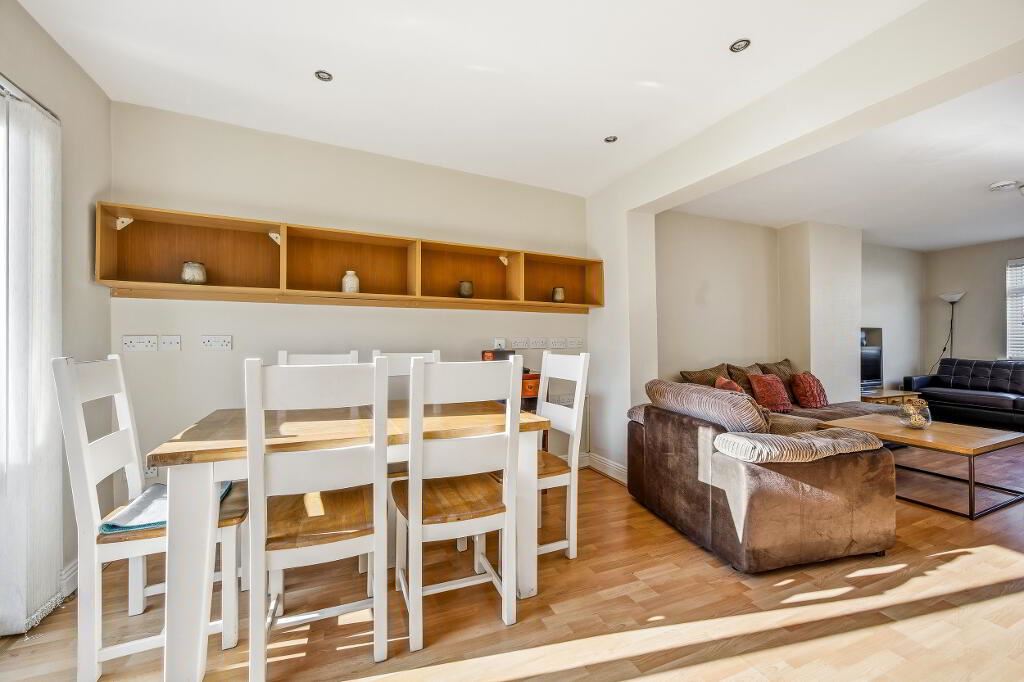 The property opens into an entrance hallway with a reception room on either side. To the right, the living room flows through to a spacious dining area, which benefits from access to the south-facing rear garden. From the dining area, there is a doorway leading to an inner hallway that connects to a fully fitted kitchen and a guest WC. The kitchen also provides direct access to the garden. Upstairs, there are three generously sized bedrooms along with a guest bathroom.