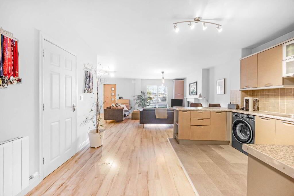 No. 54 The Briars is a spacious ground floor, two bedroom, two bathroom apartment extending to approximately 80 sq. m. / 861 sq. ft. Upon entering, you are welcomed into a bright open plan living, kitchen, and dining area featuring a large picture window that allows an abundance of natural light to flood the space. The living area is complemented by a gas fire with timber surround and laminate flooring. The modern fitted kitchen offers ample storage with floor and wall units, a single oven, electric hob, and tiled flooring.