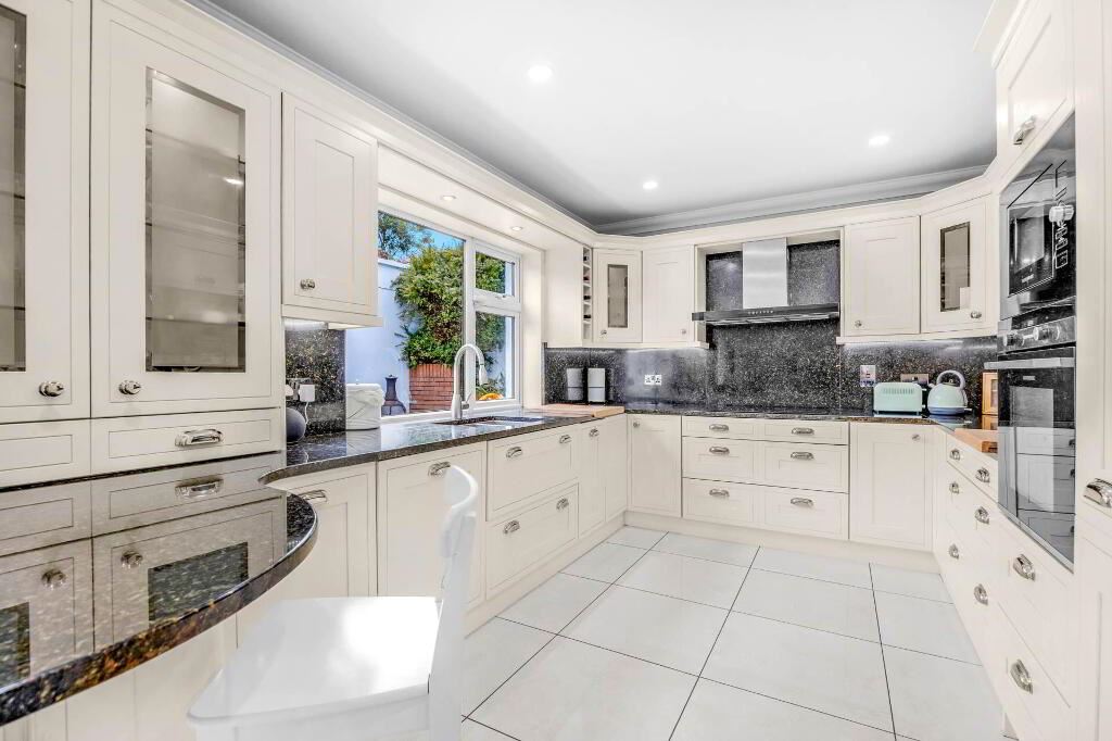 Range of floor eye level fitted press units. Integrated fridge freezer, dishwasher, single oven, microwave, electric hob extractor fan. Downlights. Ceiling coving. Tiled floor.