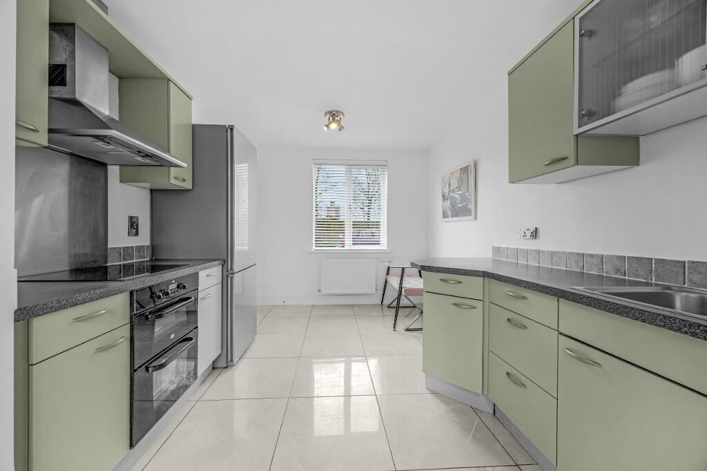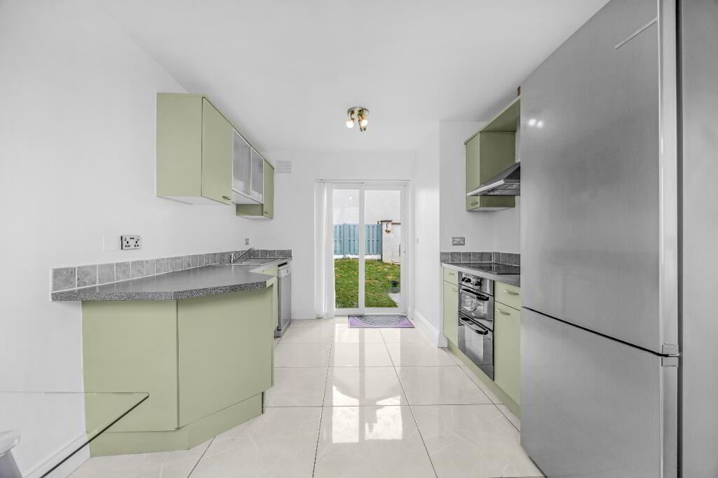 Bright double aspect room with sliding patio doors to the rear garden. Fitted kitchen with overhead units and tiled floor.