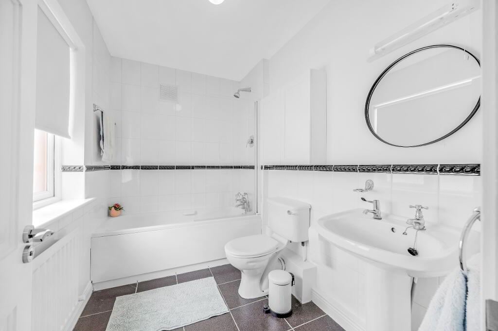 Tiled floor and part tiled walls. Bath with shower attachement and screen, WC WHB. Window.