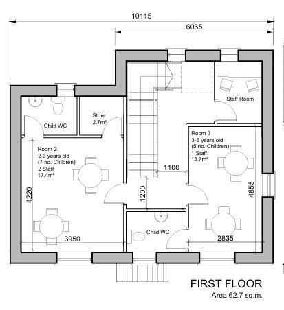 First floor: comprises of 2 further childcare rooms, both with individual access to child WC, a staff room and a store.