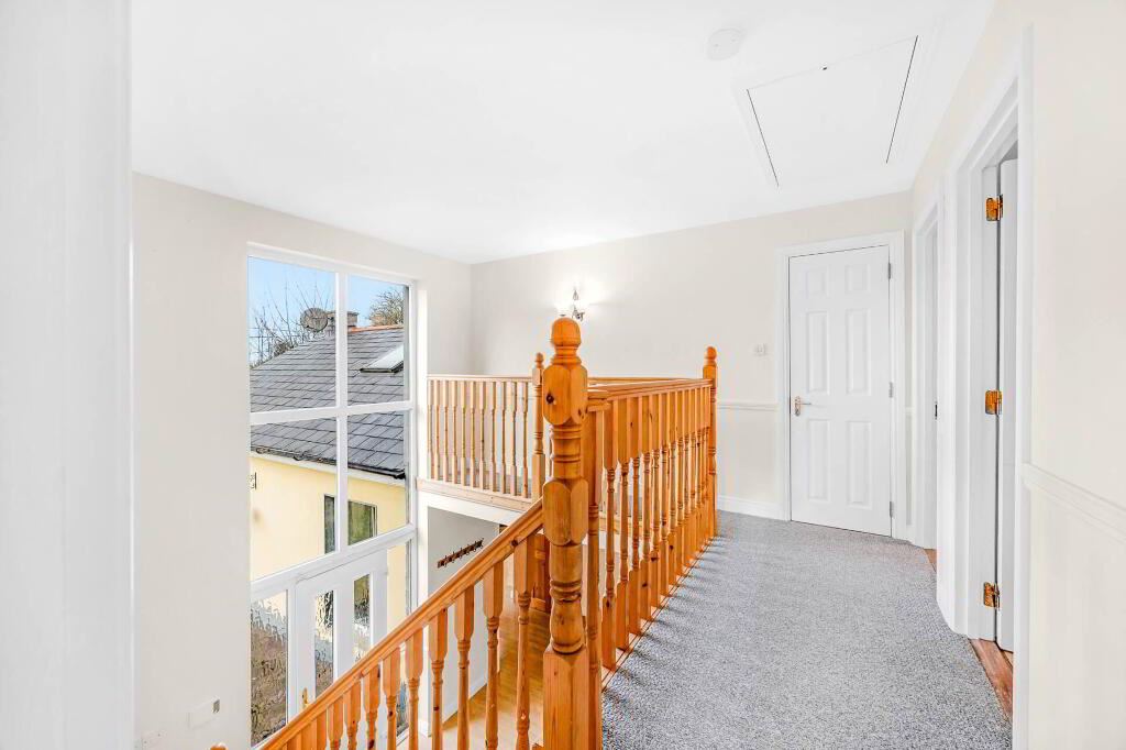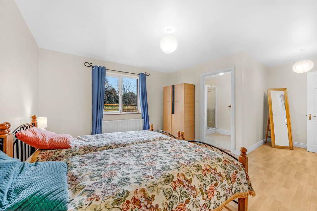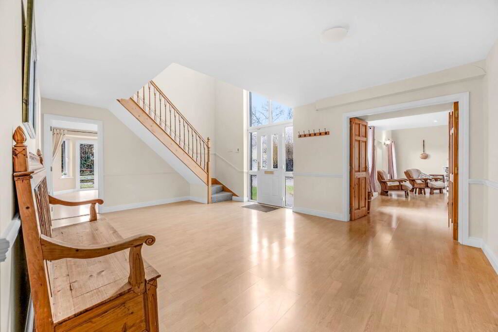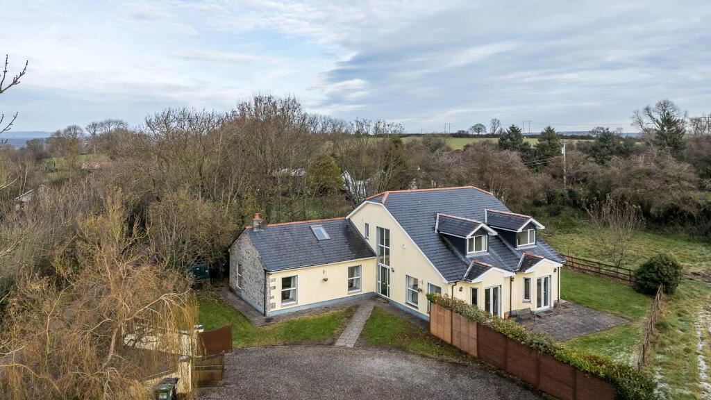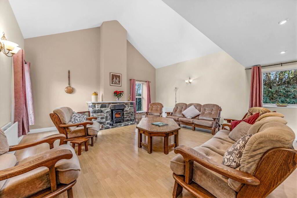 Grimes is delighted to present this exceptional and generously proportioned four bedroom detached family residence, extending to approximately 281 sq.m / 3024 sq.ft, and set on a substantial 0.71-acre (0.29-hectare) site with beautifully maintained, mature gardens that offer both privacy and tranquillity. Upon arrival, the home immediately impresses with a striking and spacious entrance hall, enhanced by a floor-to-ceiling window/front door that fills the space with natural light and creates a bright, welcoming atmosphere. The original cottage forms a character filled living area, featuring an open fireplace with a stone surround, providing a warm and inviting focal point. Above this space, a wooden mezzanine level with Velux windows overlooks the room below and offers a versatile area suitable for a home office, reading area, or additional living space. The kitchen is well-appointed with tiled flooring, an abundance of floor and wall units providing excellent storage, an electric oven and hob, and patio doors that open directly onto the garden, perfect for indoor outdoor living and entertaining. Adjacent to the kitchen is the dining room, finished with laminate wood flooring and benefiting from patio doors leading to the rear garden, offering an ideal space for family or entertaining guests. The ground floor further comprises two spacious double bedrooms, both fitted with laminate wood flooring and each enjoying the convenience of private ensuite bathrooms. A guest w.c. and a fully equipped utility room complete the ground floor accommodation. On the first floor, there are two additional double bedrooms. The master bedroom is particularly impressive, featuring a walk-in wardrobe and a generously sized ensuite bathroom. The second first floor bedroom also benefits from its own ensuite bathroom. A dedicated study / home office completes the first floor layout, ideal for remote working or study. Externally, the property is surrounded by mature gardens that provide a peaceful and private setting. A concrete block built garage with an electric roller shutter door offers secure storage or parking. Additional features include oil fired central heating and a septic tank.
